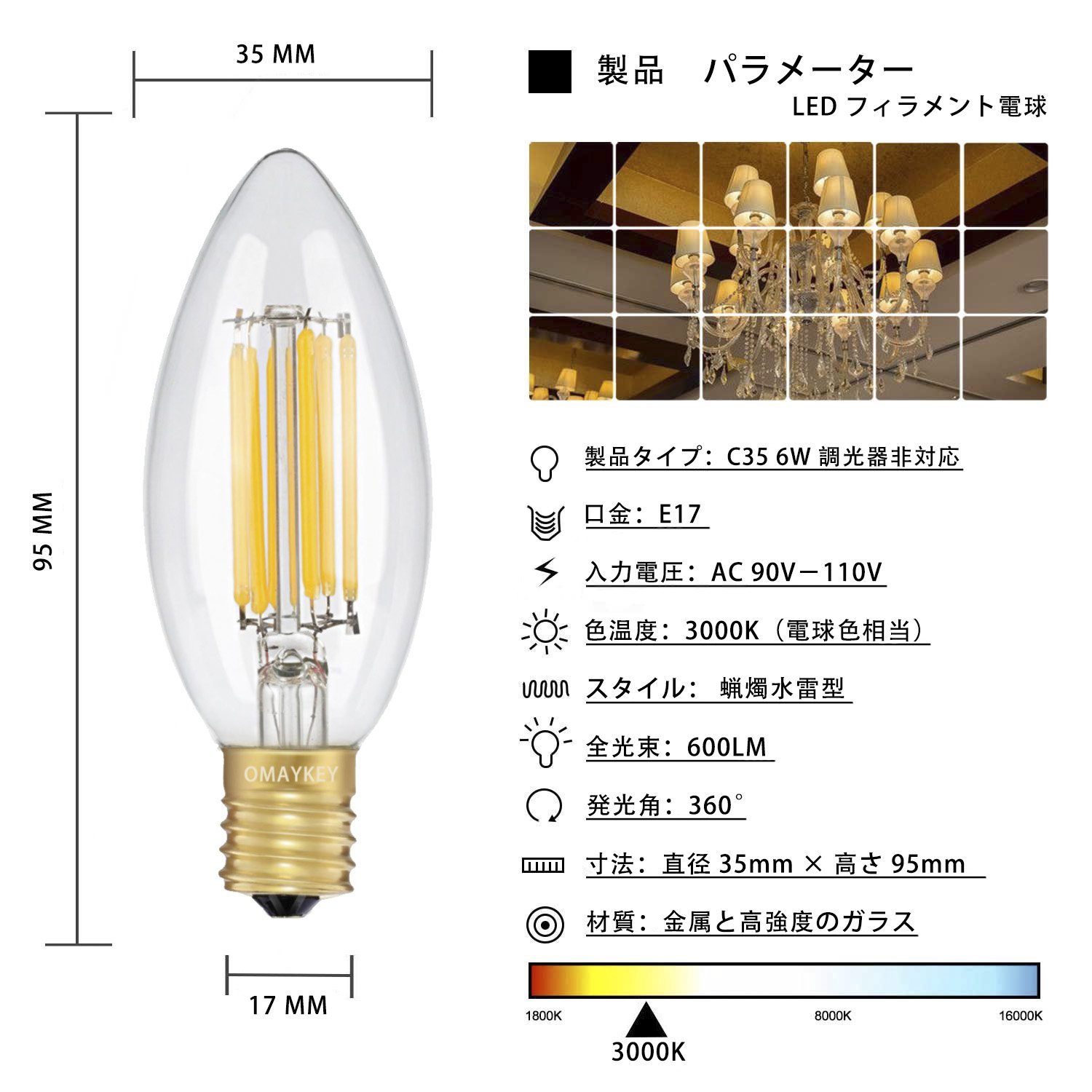 Item name: C35 6W E17 base lamp color equivalent (3000 K) dimmer not supported (1 piece included)