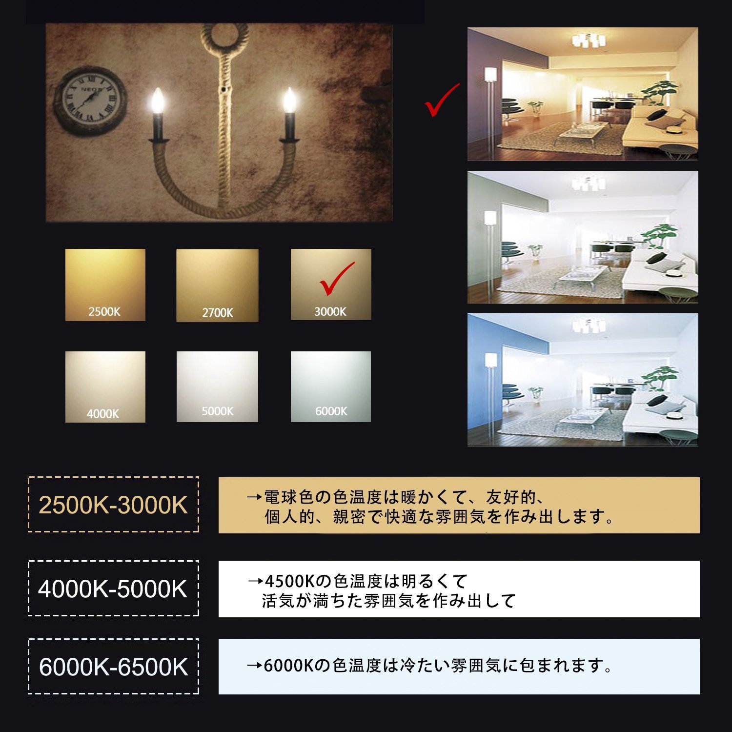 Color temperature: 3000 K (corresponding to light bulb color)