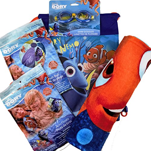 -. Binding : Toy -. Brand : Disney -. Department : boys -. EAN : 0739340238261 -. Feature : Arm Floats:2 inflates to 5.8 IN. / Beach Ball:beach ball blows up to 13.5' Inflated.;Beach Towel:measures approx (L) 58'x(W)28' made of 100% cotton / Swim Goggles:Each lens has a character on the left and on the Right adjustable straps for desired sizing / Sling Bag: measures approx (L)13'x(W)7' made of a light weight perforated canvas that will allow items to breath / Please Note: All these items are not lifesaving devices. Do not leave child unattended while device is in use. -. Genre : Other -. IsAdultProduct : 0 -. Label : Disney -. Manufacturer : Disney -. PackageQuantity : 1 -. ProductGroup : Toy -. ProductTypeName : TOYS_AND_GAMES -. Publisher : Disney -. Studio : Disney -. Title : Disney Finding Dory Beach Towel,Draw String Bag,Googles,Kids Floaties,Beach Ball Fun In The Sun Bundle -. UPC : 739340238261
