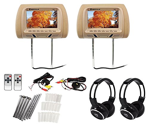 -. Feature : (2) Rockville RHP7-BG 7" Beige High Resolution Car Headrest Monitor with Speakers and IR Transmitter. 7" High Resolution Pair of Monitors. Universal - Fits Virtually All Vehicles. Easy Installation - Everything is Included (Step by step install guide included). 480 x 234 High Screen Resolution. 16:9 (Wide Screen) or 4:3 (Letterbox) Switchable Aspect Ratio. 300:1 Contrast Ratio. Bright Backlit Display / Adjustable picture, brightness, contrast, volume. PAL/NTSC Auto Switching. IR Transmitter for IR Compatible Stereo Headphones (Sold Separately). Internal Stereo Speakers. Requires External A/V Source Such as In-Dash DVD Player. RCA A/V Output. Adjustable and Detachable Metal Poles (4.3in - 7.5in). Plastic Inserts for Custom Fit to Most Vehicles. Forward/Backwards Tilting Headrest / On Screen Display Menu In English, Spanish, French, Russain, Chinese, Italian, Portugese, German, Dutch. (2) Multifunction Remote Controls Included. Color: Beige (Also available in Grey and Black). Power on/off.DC 12V Power Supply. Dimensions (HxWxD) 7.3" x 10.8" x 5.3". Height with poles 13.4" / Rockville RFH-3 Dual Channel IR Headphones. Foldable design for Travel convenience and easy storage. Comfort control leatherette ear surround. Dual channel function capable (A/B). Improved acoustic performance. 40mm Mylar dome speaker built in / Extended bass response. Impedance: 32 Ohms ±10%. Effective distance: 10 meters (max.). Light weight design for wearing comfort. Auto muting on headphone. Auto power off when no signal