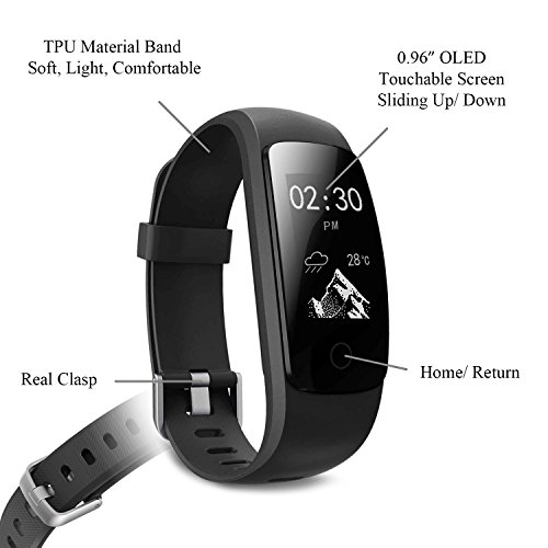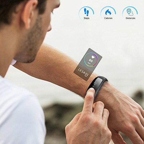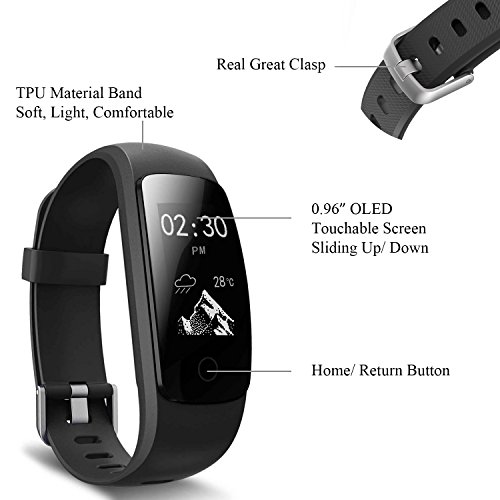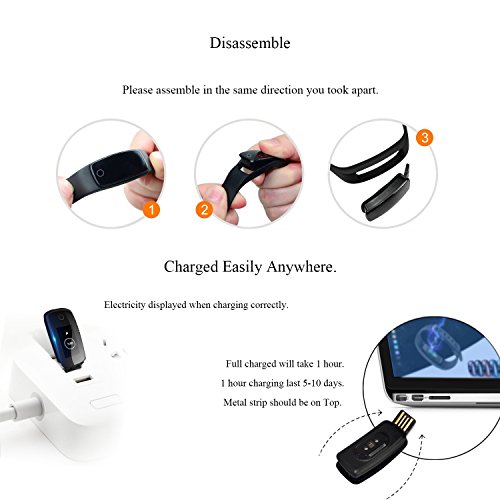 -. Feature : Activity Track: Accurately tracks all-day activities like steps, distance, calories burned, and 14 sport modes help you better understanding your daily activities / Heart Rate and Sleep monitor: Automatically monitor your heart rate and sleep, keep you informed your body status, and help you make suitable exercise plan / Long-lasting Battery Life: Simply take the band off, plug into a USB to charge 1-2 hours, a single charge gives you 5-7 days of normal usage / 0.96 Inch Full Touch Screen: clarity and brightness has been perfect upgrade, can bring you the perfect experience even in the outdoors / IP67 Waterproof: support all day wear, rain, even a swim in the pool and submerged in depths of up to 1 meter for 30 minutes