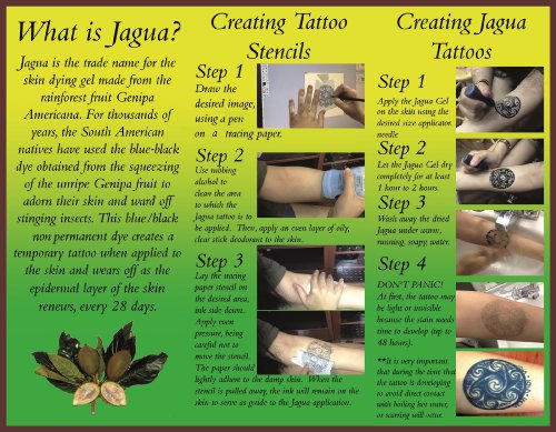 -. Binding : Misc. -. Brand : FRESH-JAGUA -. Color : Black -. EAN : 9786041502390 -. Feature : Jagua is a wonderful all-natural blue-black alternative to the red stain you achieve with henna / does not contain PPD or any other toxic chemicals. / Fresh Jagua Brand made from a Amazonian fruit name Genipa Americana / Will leave a stain on the top few layers of skin, creating an all-natural temporary blue/black tattoo. / Tattoo Stain will Last from one Week up to one Month Depending on your skin type. -. HazardousMaterialType : Unknown -. ISBN : 6041502391 -. Label : Ataraxia Creative Hand's INC. -. Manufacturer : Ataraxia Creative Hand's INC. -. NumberOfItems : 100 -. PackageQuantity : 1 -. ProductGroup : Beauty -. ProductTypeName : BEAUTY -. Publisher : Ataraxia Creative Hand's INC. -. Studio : Ataraxia Creative Hand's INC. -. Title : Fresh Jagua Tattoo Gel 8oz (236.58ml) + Applicator Bottle and 3 of the Most Used Applicator Needle Cones***top Grade Professional . Made in U.s.a Ready to Use! No Mixing Necessary