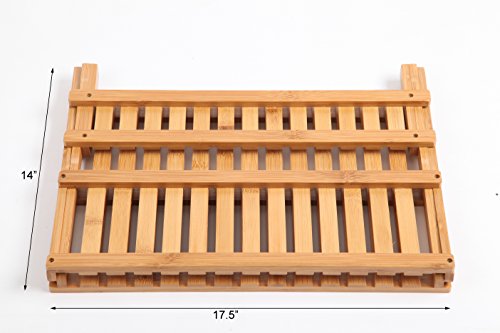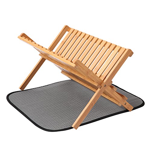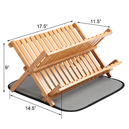 Finnhomy 2 Levels Natural Bamboo Folding Dish Rack w/ Drying Mat, Scissor Style,Light Wood Color