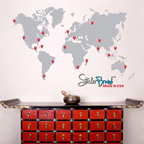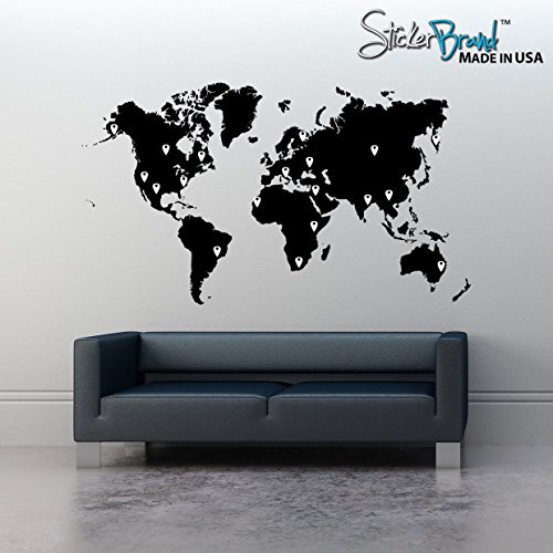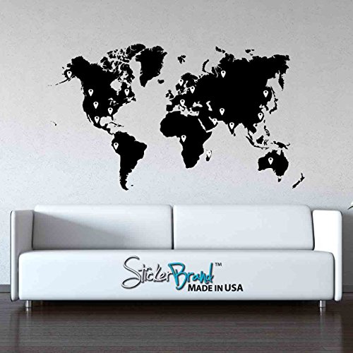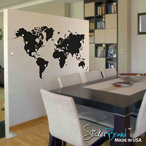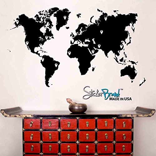 -. Feature : WALL DECAL INFORMATION: This World Map with Pins Wall Decal is 40in X 70in. item #873m (BLACK Map with 56 Red Pins, 56 White Pins, 56 Black Pins and 56 Grey Pins) = 224 Total 1/2in Pins in 4 different colors. / WHY PURCHASE A STICKERBRAND WALL DECAL? Stickerbrand has been making wall decals since 2007. Over 1 million decals sold and been featured on HGTV, THE DIY NETWORK and numerous PUBLICATIONS. -MADE IN THE USA- / BENEFITS OF USING A WALL DECAL: Wall decal stickers are mess-free, no paint, no glue/paste, no residue. They are more affordable compare to hiring a painter. They are much safer than wallpapers. *Removable but not reusable. / APPLICATION IS FUN AND REMOVABLE: Our decals can be applied on most flat surfaces, including slightly textured walls, mirrors, or any smooth surface. You can test this by applying a regular sticker on your wall, and if it sticks well, than our wall decals should work on your walls. / 100% MONEY BACK GUARANTEE: If, For Whatever Reason, You Do Not Absolutely Love Your Stickerbrand Wall Decal, Just Return It, And We Will Refund Every Penny (Or Replace It, If There Is A Problem). Please Email Us First And We Will Gladly Work With You To Resolve Any Issue.