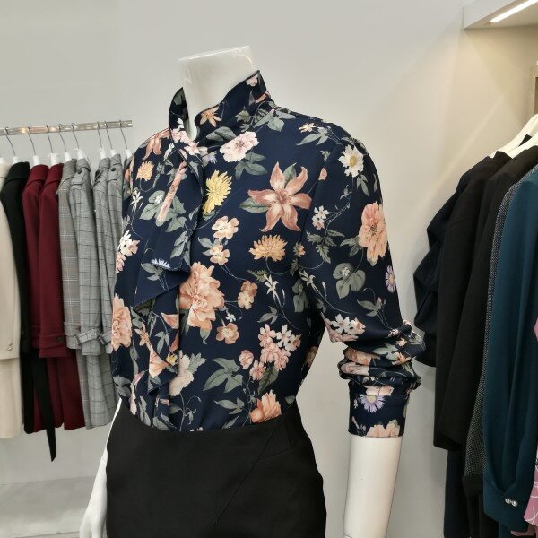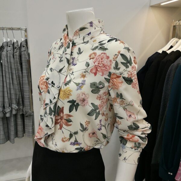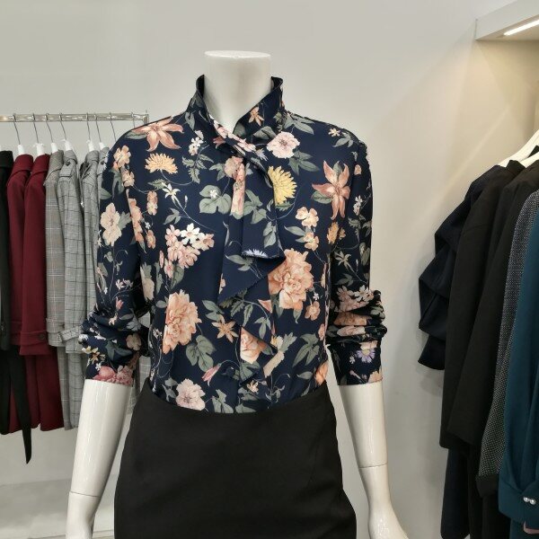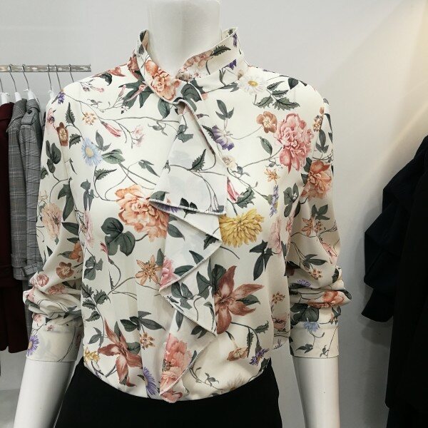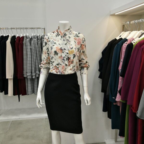 하이넥에 프릴블라우스로 여성미가 넘치며아주 고급스럽고 세련된스타일이라 코디하기가 좋다.