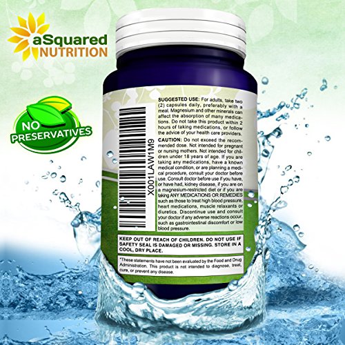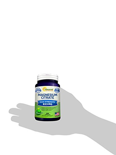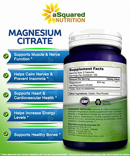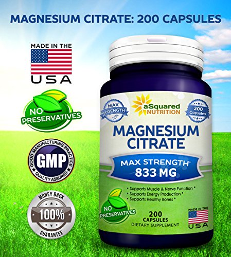 -. Feature : MAX STRENGTH MAGNESIUM CITRATE: aSquared Nutrition's maximum strength Magnesium Citrate supplement contains 833mg of pure Magnesium Citrate per serving. With 200 capsules in each bottle, you receive a full 100 day supply. Don't settle for competitive products that only offer 200mg, 400mg or 500mg of Magnesium Citrate per serving, or that only give you 90, 120 or 180 capsules, tablets or pills per bottle. * / FEEL THE DIFFERENCE: Elemental magnesium bonded to citric acid forms Magnesium Citrate, which has high absorption and bioavailability in the body. Magnesium supplementation helps increase energy levels, may help calm nerves, supports bone, muscle and nerve health, and even helps with digestion and relieving constipation. Additionally, Magnesium supports cardiovascular & heart health. * / HIGH QUALITY FORMULATION: Our Magnesium formula is made in the USA, in an FDA registered and GMP compliant facility. It contains No Preservatives, No Soy, No Gluten, & No Dairy. Magnesium supports bone, muscle, nerve and heart health. It also helps increase energy levels and relieves constipation. Magnesium is also important for regulating calcium & potassium levels. Try also our Resveratrol 1000mg, Glutathione 500mg, & Milk Thistle. * / HUGE SUPPLY - AMAZING VALUE: Our potent formula is packed with 833mg of Magnesium Citrate per serving (2 capsules per serving). Each capsule is packed with over 400mg of Magnesium Citrate. Backed by our 100% Money Back Guarantee for 30 days, you receive 200 capsules in each bottle. Don't settle for other products that only offer 200mg, 400mg or 500mg per serving, or that only give you 60, 90 or 120 capsules, tablets, or pills per bottle. * / MANY FORMS: Not all magnesium supplements are the same. Some have high bioavailability & absorption, and others have higher concentrations. Forms include: Magnesium Amino Acid Chelate, Elemental, Magnesium Oxide, Chelated Glycinate, Orotate, Chloride, Ionic, Sulfate, Carbonate, Taurate, & Aspartate. Magnesium comes in tablets, capsules, pills, soft gels, powder, liquid & drops. Try also our CoQ10 200mg or 400mg, All Natural Turmeric Curcumin, Methyl Vitamin B12, & SAM-e 500mg. *