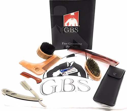 GBS 9 Piece Beard Deluxe Grooming Set - Beard Catcher Bib Cape, Template, Stainless Steel Shavette, Oval Wood Beard Brush, Travel Synthetic Beard Brush,...