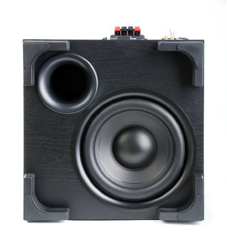 -. Feature : Ultra efficient low-distortion, 75-watt amplifier with 150-watt peak output / Low-distortion 8-inch polypropylene cone woofer / Low-turbulence port for extreme bass output / High-density cabinet construction / Connects via Stereo Left/Right Inputs or Home Theater LFE Input