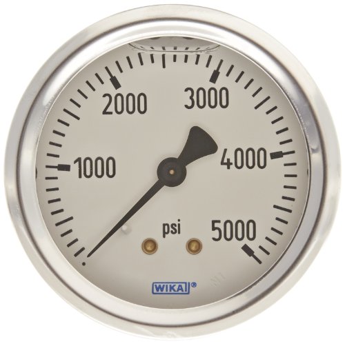 WIKA 9767274 Industrial Pressure Gauge, Liquid/Refillable, Copper Alloy Wetted Parts, 2-1/2" Dial, 0-5000 psi Range, +/- 2/1/2% Accuracy, 1/4" Male NPT Connection, Center Back Mount