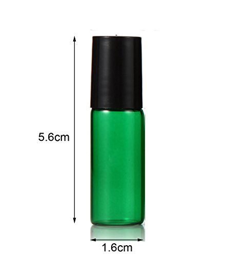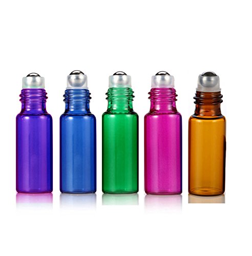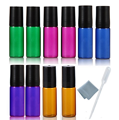 ELFENSTALL 10pcs Amber/Blue/Green/Pink/Purple 5ml(1/6oz) Roll on Glass Bottle for Essential Oil - Empty Aromatherapy Perfume Bottles - Refillable Slim with Metal Ball and Black Lid + FREE Dropper