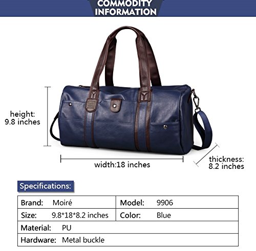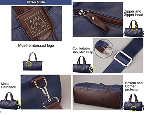-. Binding : Electronics -. Brand : Moiré -. Color : Blue -. EAN : 0642872873643 -. Feature : Authentic Moiré Duffel Bag:Handcrafted PU leather messenger bag with Rust free metal hardware- Includes Certificate of Authenticity Moiré card / Versatile and Stylish: carries clothes, laptops, tablets, magazines, cell phone, gym attire,etc / Modern Men's design exudes suaveness and character of Moiré. Designed in California and comes with Certificate of Authenticity card. / Five compartments to fit your utilities. Adjustable shoulder strap. Waterproof and wrinkle-free material will last any journey ahead. / Measures: 18x9.8x8.2 in Spacious and compact design ONE YEAR WARRANTY -. Label : Moiré -. Manufacturer : Moiré -. ProductGroup : Apparel -. ProductTypeName : CARRYING_CASE_OR_BAG -. Publisher : Moiré -. Size : Medium -. Studio : Moiré -. Title : Moiré Insignia Duffel Bag Modern Leisure Messenger Mens Travel Weekend Bag -. UPC : 642872873643