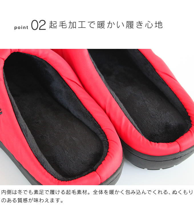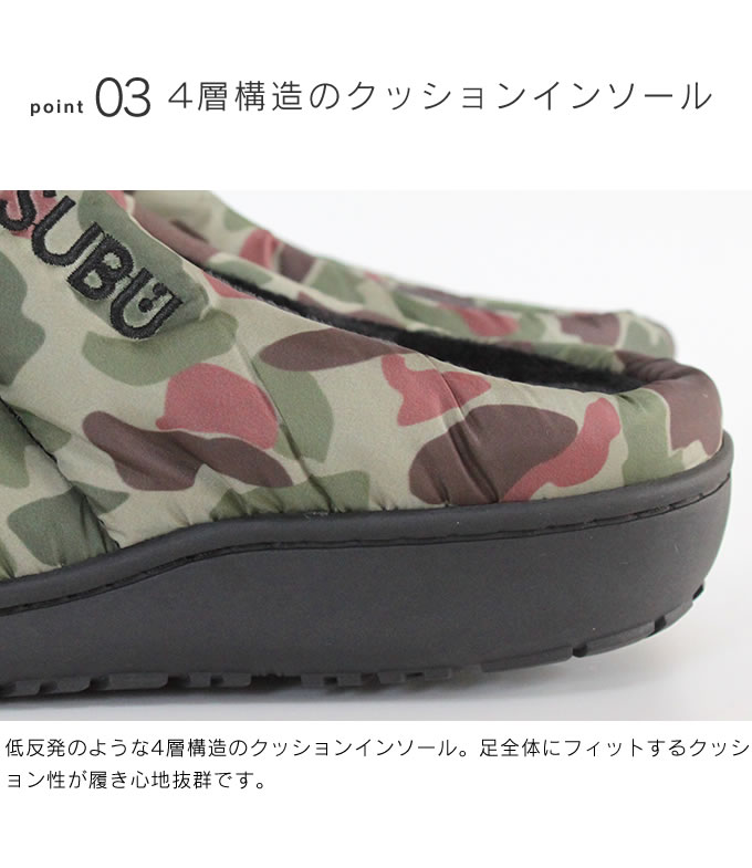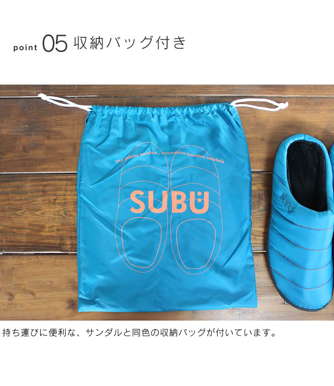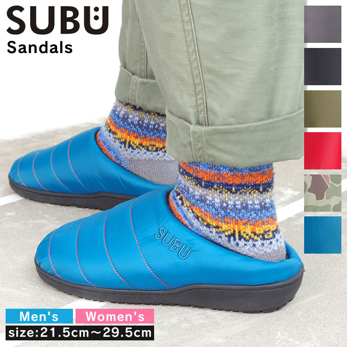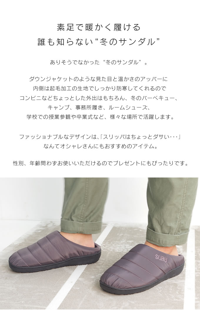 | ポイント | 誰も知らない冬のサンダルとして発売されたSUBUのサンダルは冬のサンダルイメージを変えるアイテム。 サンダルでは寒いなと感じる時も素足で履けるスタンダードデザインのSUBU。 ダウンのような暖かさと、起毛加工の内側の生地は冷え性の方にも喜ばれます。 アッパー部分に撥水加工(Teflon/テフロン)性別、年令問わず楽しめるサンダルは冬の新定番です。 |