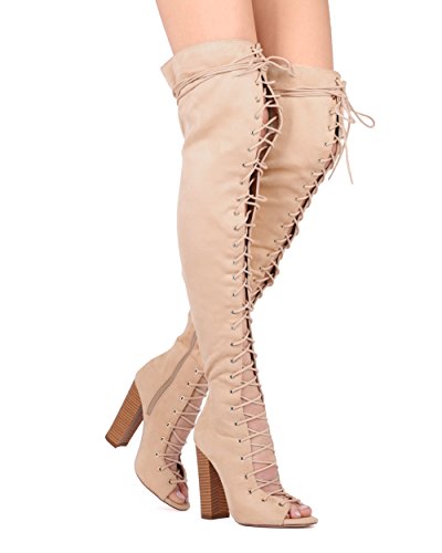 (Alrisco)/Women's/Boots/DIRECT FROM USA/Alrisco Women Faux Suede Over The Knee Peep Toe Lace Up Block Heel Boot - HG18 by Liliana Collection