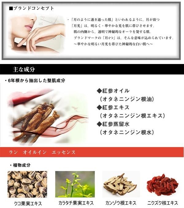 | 成分 | オタネニンジン根水、PEG/PPG-17/6コポリマー、グリセリン、グリセレス-26、ヤシ油脂肪酸PEG-7グリセリル、PEG-40水添ヒマシ油、BG、オタネニンジン根油、オタネニンジン根エキス、クコ果実エキス、カラタチ果実エキス、カプリリルグリコール、カンゾウ根エキス、ニクズク核エキス、レシチン、パンテノール、水、ポリアクリレートクロスポリマー-6、トリ(カプリル酸/カプリン酸)グリセリル、ジメチコン、EDTA-2Na、フェノキシエタノール、香料 |