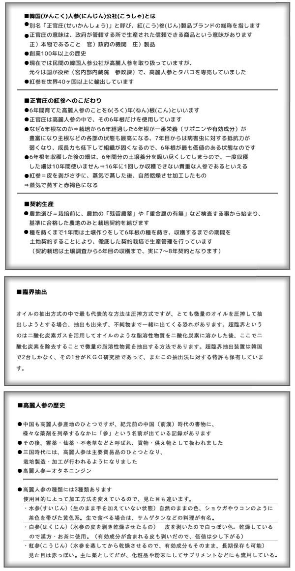 世界58ヶ国以上で販売されている韓国化粧品の人気商品。正官庄の高麗人参(6年根)から抽出した紅参オイルを配合。1本で化粧水・乳液・美容液・クリーム・パック・ヘアーケア・バスオイル・マッサージオイルの8役をこなす多目的美容液です。乾燥を防ぎ、ハリと潤いを与えます。 |
