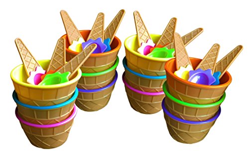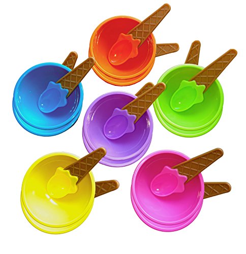 Studio : ice cream bowls Publisher : ice cream bowls Product Description The moment you get these plastic ice cream dishes out, everyone in the room will be ready for a treat! These dishes are a great addition to any summer party. --- What's in the box? --- Set of 12 ice cream bowls and spoons in blue, pink, green, orange, yellow, and purple. --- Dimensions --- Bowls are 3.75" in diameter, about 2.5" Tall and hold 6-8 fl ounces. It fits a large scoop of ice cream with some room for toppings. 0