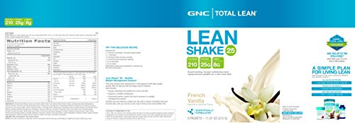 -. Binding : Health and Beauty -. Brand : GNC -. EAN : 0048107170950 -. Feature : Great-Tasting, Hunger-Satisfying Meal Replacement Suitable For A Low-Carb Diet / Lean ShakeTM 25- Healthy Weight Management Support / This Great-Tasting Meal Replacement Is Well-Balanced With High-Quality Protein, Fiber To Help You Feel Full Longer, And 22 Vitamins And Minerals. / Hunger-Satisfying And Suitable For A Low-Carb Diet Supports A Healthy Metabolism Convenient Portion Control, The Key To Success In A Weight Management Program / Combine Just Two Delicious Shakes Per Day With A Calorie-Controlled Meal And Exercise Plan, And You Can Be On Your Way To Living A Lean And Healthier Life. -. Label : GNC -. Manufacturer : GNC -. MPN : 269656 -. PackageQuantity : 1 -. PartNumber : 269656 -. ProductGroup : Health and Beauty -. ProductTypeName : HEALTH_PERSONAL_CARE -. Publisher : GNC -. Size : 6 servings -. Studio : GNC -. Title : GNC Total Lean Lean Shake 25- French Vanilla -. UPC : 048107170950