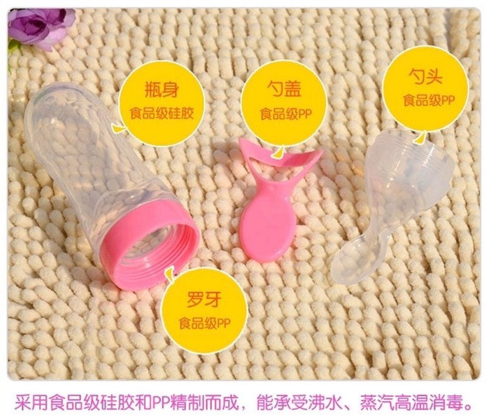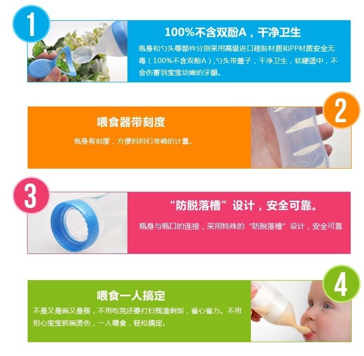 特点:采用安全硅胶材质,耐高温。特有带盖勺子,适合给宝宝喂米糊,辅食,牛奶等等!宝宝离乳期的过度奶瓶,是宝宝必备神器哦!
