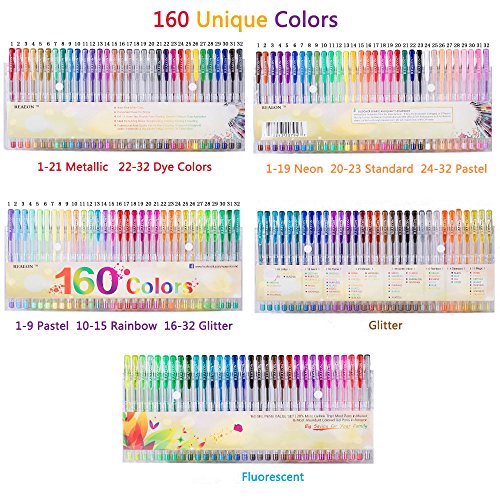 160 XL Gel Pen Set: There are all unique colors and 20% more ink- Including Glitter, Metallic, Glitter Neon, Neon, Pastel, Magic, Swirl, Standard.