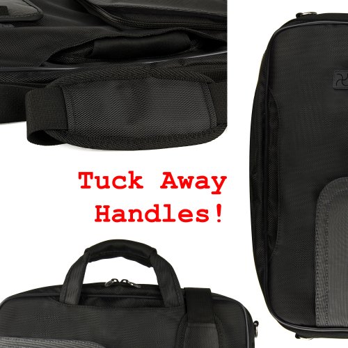 -. Title : Innovative 17 inch Black Pindar Travel Friendly Laptop Bag for the Toshiba Satellite P775 Series Ultrabook with Extra Features: Reinforced construction, Velcro charging port to charge without removing device, Apple iPad sized Pocket for tablets or eReaders, Unique pull down Smartphone & MP3 front pocket with earphones slot, and Tuck Away Handles!!! + Compatible Earbuds and Wireless Mouse!