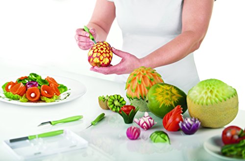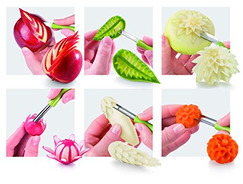 -. Feature : Aus Edelstahl / Perfekt zur Dekoration von Obst und Gemüse / Nicht spülmaschinengeeignet / Edelstahl / Universelles Set zum Garnieren von Gemüse und Obst - Möhre, Rettich und Radieschen, Salatgurken, Zucchini, Porree, Kürbis, Äpfel, Birnen, Mango, Melonen usw. / Das Set besteht aus 6 speziellen Schnitzmessern, einem keramischen Wetzstein und einem Kasten für sichere Aufbewahrung. / Aus erstklassigem rostfreien Edelstahl und robustem Kunststoff hergestellt. Messer sind spülmaschinenfest, der Wetzstein im Geschirrspüler nicht spülen. / Gebrauchsanleitung in der Verpackung beiliegend. / 3 Jahre Garantie.