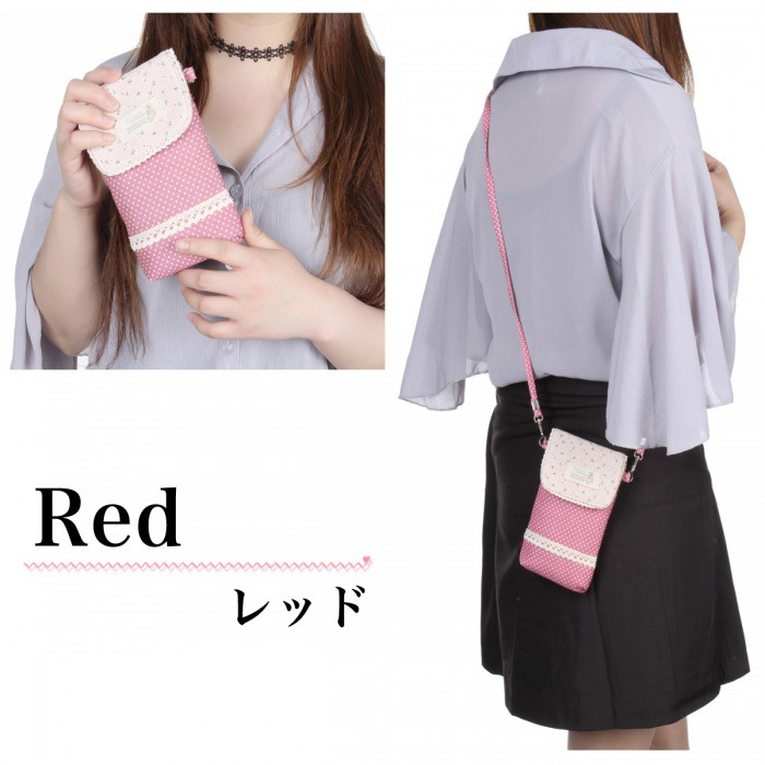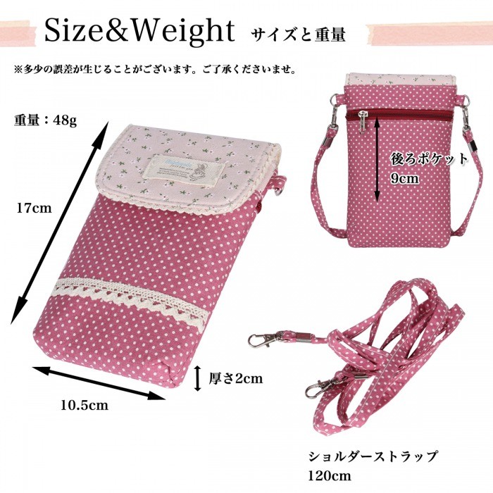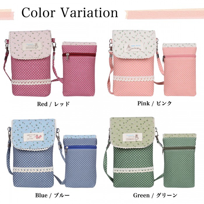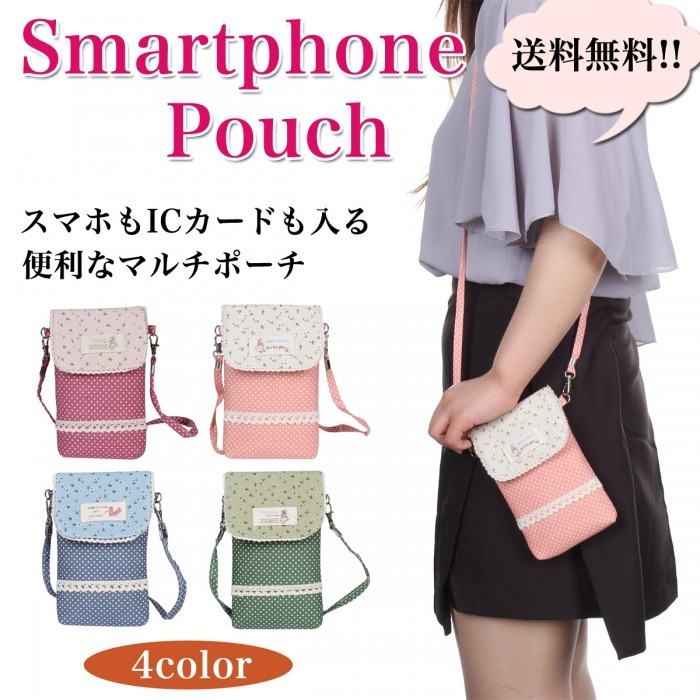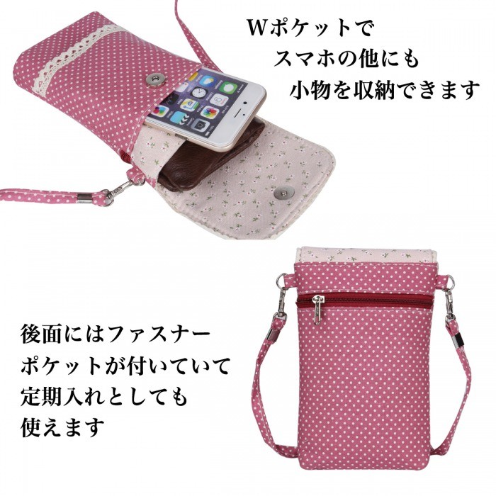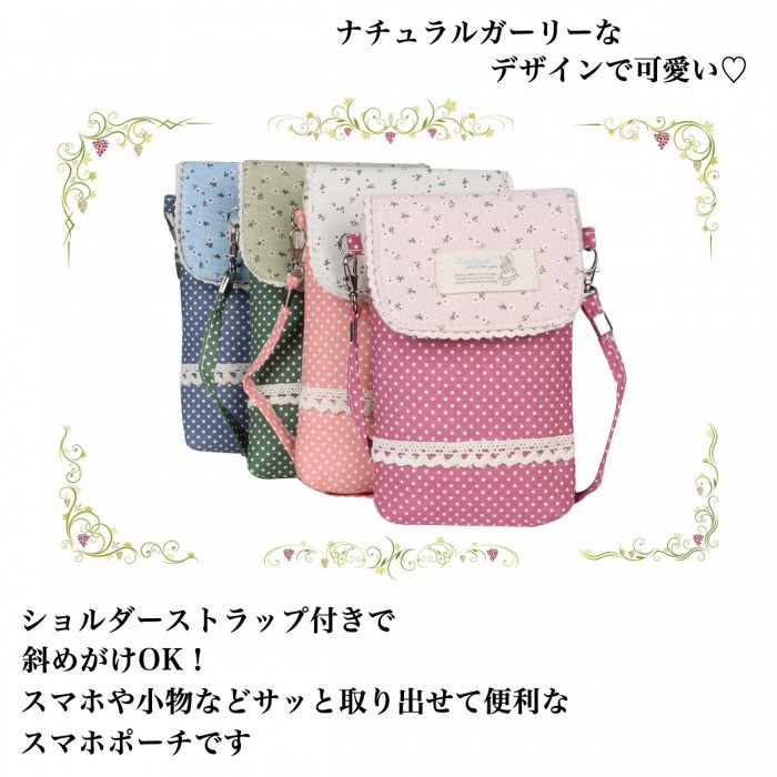 ナチュラルガーリーなデザインが可愛いスマホポーチWポケットとファスナーポケットにはスマホ、小物、ICカードなど、小分けにして収納できます。軽量なので持ち運びラクラクです♪ショルダーストラップ付きなので斜めがけもできて便利ちょっとしたお出かけや旅行の時にも重宝するポーチです。【仕様】◆サイズ(約):縦:17cm 横:10.5cm マチ:2cmストラップ:120cm◆重さ:48g◆素材:綿◆カラー:レッド、ピンク、ブルー、グリーン※ お使いのパソコン環境により実際の色と多少異なる場合がございます。【注意】※ゆうメールでの発送となります。※配達日、配達時間の指定はお受けできません。※追跡番号はついておりません。あらかじめご了承下さい。