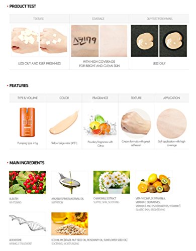 -. Feature : UV Interception SPF50+/PA+++ (Whitening + Wrinkle Improvement), KFDA 3 Functions Certification. / Upgraded sunscreen that prevents skin discoloration and skin aging with UV A and B sun protection, a triple function BB cream that makes skin bright and smooth, strengthens skin's overall protection capacity and blocks melanin formation while giving elasticity to sagging skin. / Phytosphingosine and Ceramide as similar ingredients to skin can strengthen skin's protective barrier and maintain balanced skin condition. OSMOPUR-N and Vital-V Complex soothe and protect a skin which can be easily damaged from various harmful environments to make a moisturized, healthy skin. / Soft, moist texture with W/S component is lightly absorbed into a skin while excellent adhesion makes skin transparent and clean.