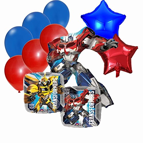 -. Feature : This balloon bouquet contains 11 pieces / (1) Jumbo Shaped Transformer Optimus P.R.Ime Mylar Balloon / (2) 18" Transformers Mylar Balloons / (2) Red Star Mylar Balloons / (3) Red 11" Latex Balloons (3) Blue 11" Latex Balloons