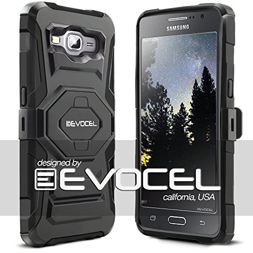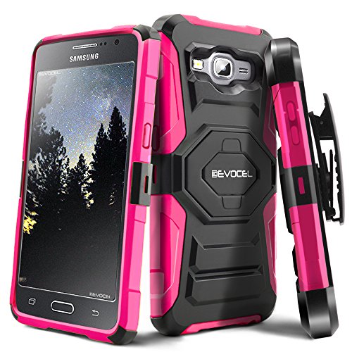 Stylize and protect your Samsung Galaxy Grand Prime (G530 G530H G530F G530M G530T G530AZ S920C) with the [New Generation] Rugged Holster Dual Layer Case with Kickstand and Belt Swivel Clip by Evocel®.The case offers multiple layers of protection: a soft shock-absorbing silicone inner layer with an impact-resistant polycarbonate shell that slides into the outer locking belt clip swivel holster. The built-in locking Kickstand is perfect for viewing content in landscape orientation and the 180-degree rotating swivel belt clip allows for a variety of carrying options as well as viewing angles for movies, e-books, and your favorite content.