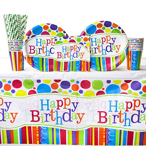 Bright and Bold Party Supply Pack for 16 Guests: Straws, Dinner Plates, Luncheon Napkins, Cups, and Tablecover (Bundle for 16)