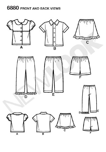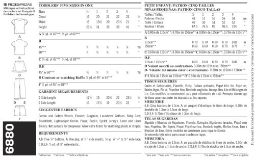 -. Feature : Toddler Separates in size A (1/2-1-2-3-4), New Look Pattern #6880 / Number of looks included: 6 / Designed in UK, Manufactured in USA / Instructions are written in English, Spanish, and French / Sested fabrics: Cotton and Cotton Blends, Flannel, Gingham, Laundered Cottons, Baby Cord, Broadcloth, Lightweight Denim, Pique, Poplin, Eyelet, Jerseys, Linen and Linen Blends; not suitable for sleepwear
