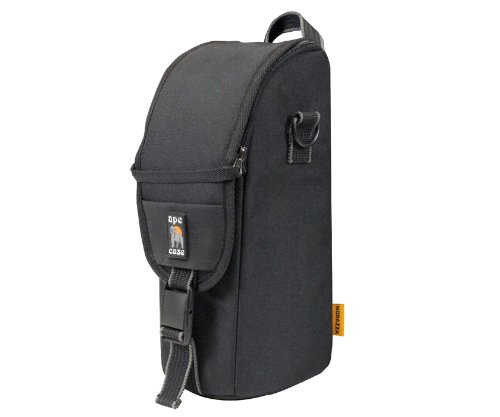 ACPROLC18 Ape Case Professional Large Lens Case is a strong and versatile way to store and carry your precious DSLR Lens and is made with the high quality materials and craftsmanship you have come to expect from Ape Case. This Pro Lens Case is designed to hold most modern 300-2.8 lenses. (please check interior case dimensions closely against your lens' measurements) The ACPROLC18 is fully padded and features an extra, removable interior base pad for even more protection on the case bottom where you need it the most. This Pro Lens Case can be carried with the supplied shoulder strap, or by hand with top loop handle. There is also a uniquely designed belt/loop attachment system that has a standard-type sewn-in 3.5-Inch loop for belt attachment, plus a stiff hinged openable and closeable Velcro clasp-type "attatcher" that can be used on a belt or used to attach to another case that has a loop (like our ACPRO1800, ACPRO1900, ACPRO2000 or ACPRO4000). The top opening is generously sized for easy lens retrieval. The dual zippers are joined together with a zipper pull that allows you to zip or unzip both zippers simultaneously gaining quick lid opening access. The lid is also secured with an adjustable quick release clasp. All together, the lid system allows for secure closure, yet quick and easy access. There is a slim pocket on the front of the case under the lid to hold memory cards. The case also features Ape Case's signature "black on the outside yellow on the inside" color scheme. The Hi-Vis Yellow interior makes seeing what is in your case a breeze.Feature