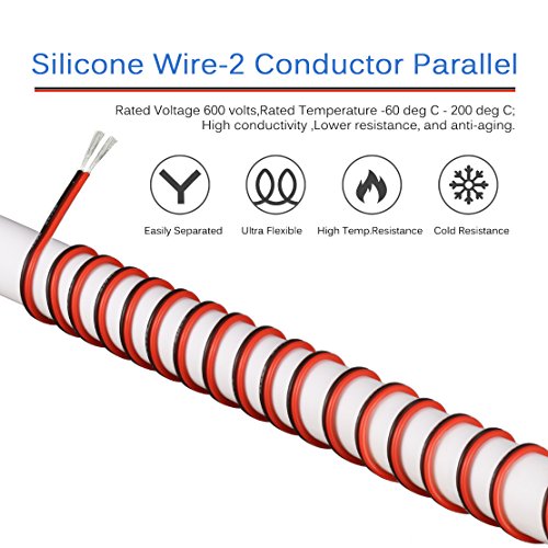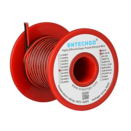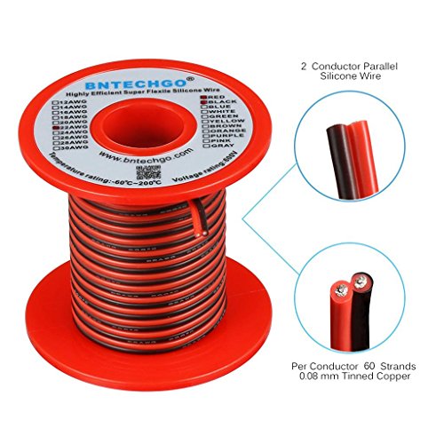 Studio : bntechgo.com Publisher : bntechgo.com Product Description BNTECHGO 22 AWG red black 2 conductor parallel silicone wire,ultra flexible soft,easily separated,easily to use. Long life: 22 Gauge 2 conductor parallel silicone wire Core made with 60 strands 0.08 mm tinned copper wire per conductor,tinned copper wire has a better anti-oxidation performance,fetures high conductivity,lower resistance,reduce the producing of heat,and anti-aging. Silicone rubber insulation which make it more durable and eco-friendly.High temperature resistance 200 degree C,low temperature resistance,in extreme cold -60 degree C. Rated Voltage:600 volts. Widely used:for single color LED strip lights,various DC electrical hookups including model planes,model cars,model ships,batteries,lamps,household appliances,electric heating appliances,meters,instruments,motor lead wire and digital fields. Specification: Wire Guage:22 gauge Length:25 ft spool Rated Temperature: -60 degree C - 200 degree C Rated Voltage:600 volts Color:red black 2 conductor parallel Also available 14 gauge,16 gauge,18 gauge,20 gauge ultra Flexible 2 conductor parallel silicone wire. 0