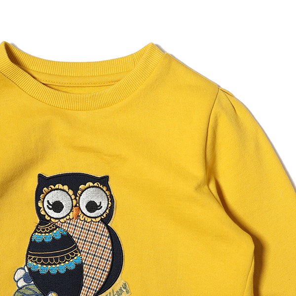 소재-겉감 : 면 100 배색 : 면 95 폴리우레탄 5 색상-머스타드 사이즈-110,120,130,145,155,165상세설명-앞쪽 절개라인에 변형을 준 티셔츠로 앞쪽에 큰 부엉이 아플리케 자수가 포인트로 들어간 스타일입니다.