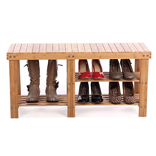 - Feature : MULTIFUNCTIONAL BAMBOO BENCH - 100% natural bamboo, environment friendly and sturdy; 2 tiers bamboo rack & storage bench for shoes, boots, bags, plants, toiletries, baskets in entryway, bedroom, bathroom, closet, etc. / INNOVATIVE DESIGN - Two-tier shelves on one side for short shoes, one tier larger section on the other side for boots and heels / THOUGHTFUL WORKMANSHIP - Natural and smooth finish, rounded corners, protect your family from being scratched, especially the children / EASY ASSEMBLY AND DISASSEMBLY - Antirust and durable screws can be installed and disassembled repeatedly, tools provided / SPACE-SAVING STORAGE BENCH - Product Size: 34 1/4"L x 11 1/8"W x 17 3/4"H (87 x 28 x 45 cm), slim figure to put in your cubby closet, wardrobe, cabinet, garage, entrance, foyer and other storage area