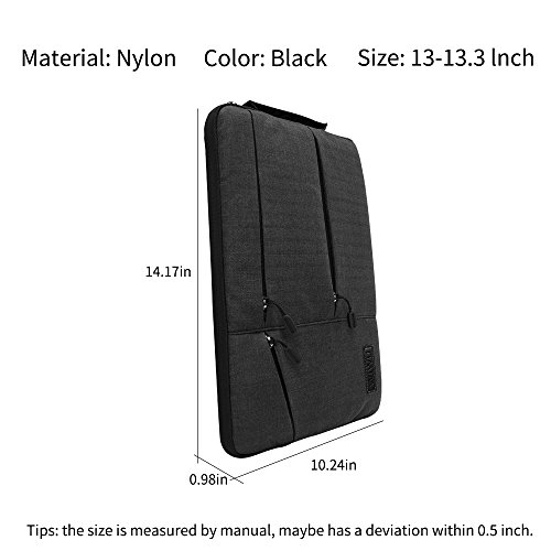 -. Feature : 360° Superior Protection. Perfect protect for your laptop. / High Quality Material. Waterproof nylon fabric, soft and durable. / Multi Pocket Design. Extra space for your small items, such as power adapters, cables, pens and notepads, more convinent. / Lightweight and Portable. 250g weight, you can keep it everywhere you want. And you can keep it in your backpack or suitcase. / Practicality.It is not only designed for 13 - 13.3 inch Macbook Air/ Macbook Pro/ Retina Dispaly 12.9 Inch Ipad,but also fits for the other laptops with the size.