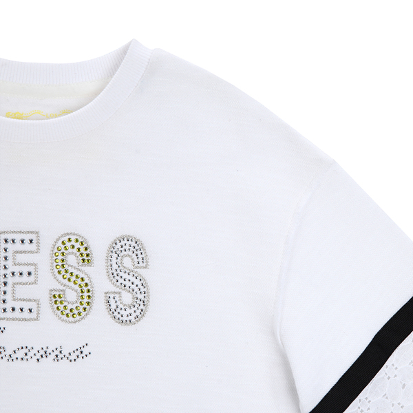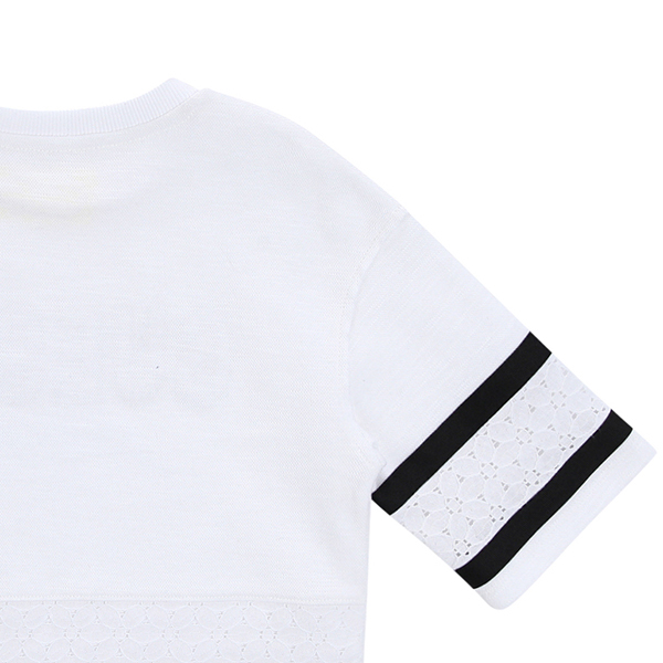 소매 밑단 라인과 BACK라인 하단의 레이스 배색으로 여아스러운 디테일을 더해준 스타일.