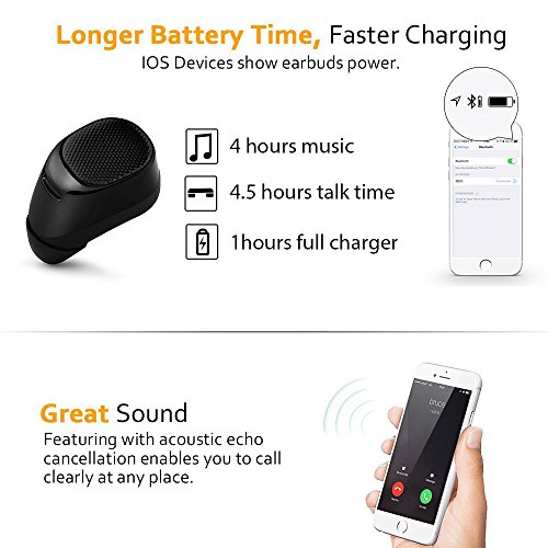 LONG BATTERY LIFE>> Built-in 50mAh rechargeable lithium-ion ploymer battery, provides up to 4 hours music time, 4.5 hours continuous talk time and up to 5 days standby time on a full charge around 1 hours. Support IOS device power display.