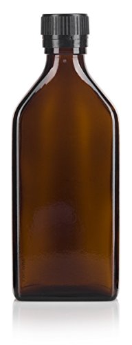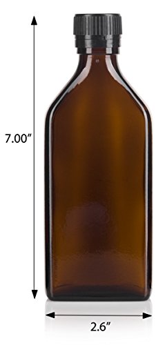 250 ml / 8 oz Amber Glass Pharmacy Liquid Medicine Flask Bottle with Black Ribbed Tamper Evident Seal and Pouring Insert (2 pack) + Labels
