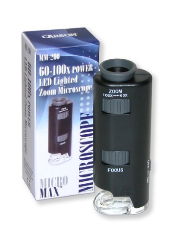 Lightweight and portable, the Carson MM-200 MicroMax pocket microscope is ideal for on-the-go science. The MicroMax offers a powerful 60 to 100x magnification range, making it easy to examine blood samples, bugs, and anything else that's worthy of a closer look. The microscope also includes a built-in LED light that provides a bright, clear image, along with a rubberized eyepiece for comfortable viewing. Best of all, the MicroMax fits conveniently in a jacket pocket, so you can bring it along wherever you go--whether it's a school field trip or a visit to a friend's house.