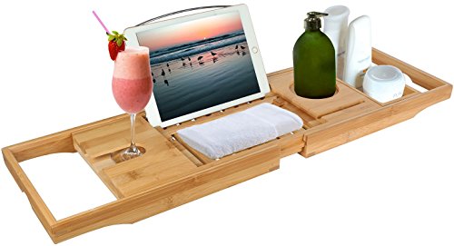 Overview This is a multi-functional bathtub rack that holds plenty of stuff you could ever want as you relax in the tub. The large platform comes with a wine glass holder, a wine glass holder, a tablet holder, a cup slot, a phone slot and a towel slot. And two sides can be extended up to 105.5cm/42 inches that is suitable for most type of bathtubs. You can sit for hours in most quiet place in the house and spend time reading or watching along with a cup of wine or a cup of juice in the bath time. Specification - Material: natural bamboo, polyester, stainless steel