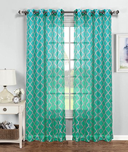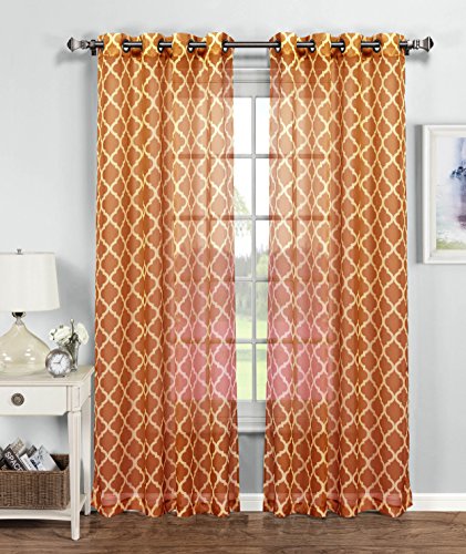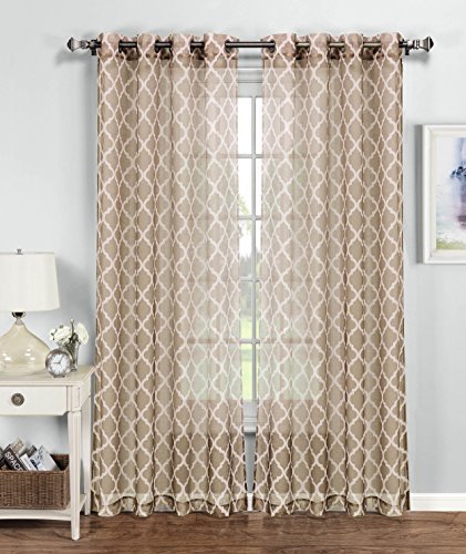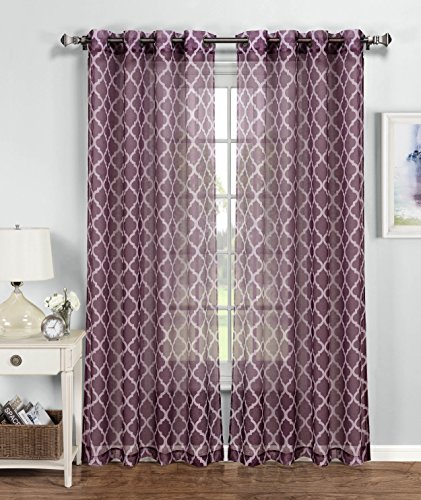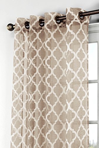 Add style and elegance to any living space with sheer curtain panels. Quatrefoil decorative printed curtain panels add style, filter light and create privacy for any room in your home. Update your existing drapes by layering with printed sheers or hang two or more sheer panels on their own to let in just enough light during the day and provide light coverage at night. Easy slide, decorative metal grommets slide back and forth to create instant privacy in one easy movement. Hang two or more sheer panels for desired fullness. Perfect for bedroom, living room, dining room and kitchen, sheers are a versatile alternative to heavy drapes. Consider sheers for adding subtle color to a child's room or nursery. Each panel offers extra wide 54 in. coverage in 84 in. length. Sold as a single curtain panel. Antiqued metal grommets fit up to a 1.5 in. curtain rod. Curtain rod sold separately. Easy care, machine wash cold, delicate cycle with mild detergent. 100% polyester. Imported.Feature