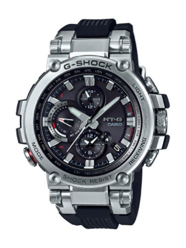 Brand, Seller, or Collection Name:Casio Part Number:MTGB1000-1A Dial window material type:Sapphire Display Type:Analog Clasp:Buckle Case material:Stainless Steel Case diameter:5.2 centimeters Band Material:Rubber Band Color:Silver Dial color:Black Calendar:Full Auto Calendar Item weight:16 Ounces Movement:Quartz Water resistant depth:200 Meters