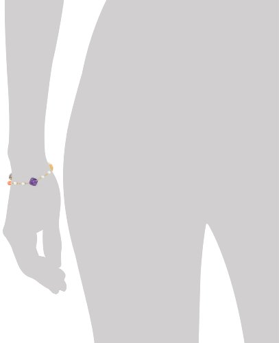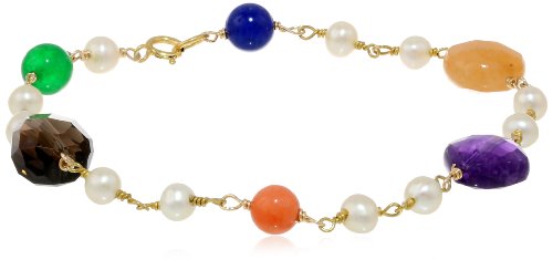 Multi-Gemstones and Marble Flower, Gold over Silver Linked White Freshwater Cultured Pearls Bracelet, 7.5"