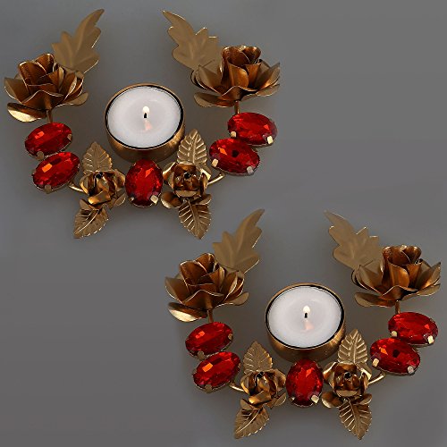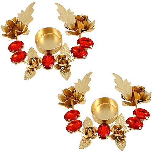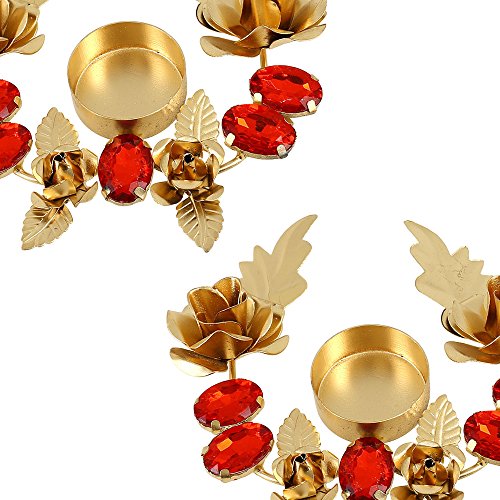 Set Of 2 candle lights holders - A BEAUTIFUL ADDITION TO YOUR CHRISTMAS DECORATIONS With 4 golden flowers,6 golden leaves and 5 red dazzling beads