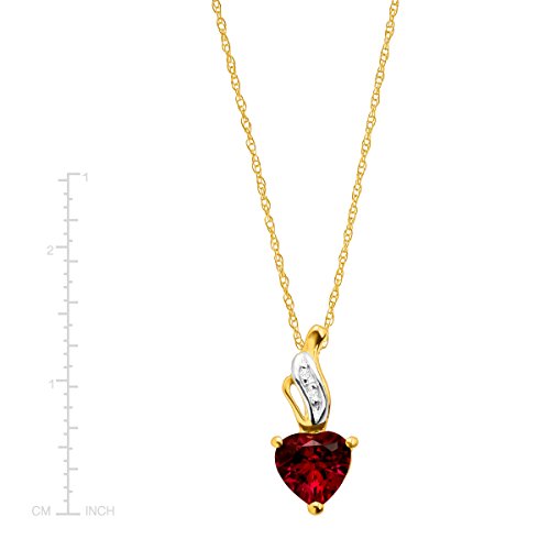 Show her you love her with this petite pendant! A 1 ct heart-cut created ruby is accented with round-cut diamonds in a swirling setting of 10K gold. Piece measures 9/16 by 1/4 inches. Comes with a 10K gold 18-inch rope chain with a spring ring clasp.Feature
