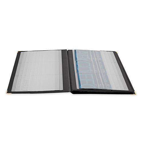Business card book features dual-fold cover for easy viewing. Durable black vinyl cover with metal-tipped corners stands up to active use. Includes 32 transparent pages to hold a generous total of 192 cards.
