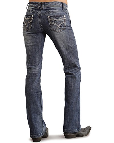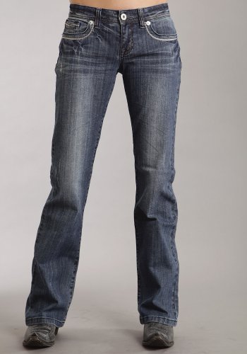 Low rise, a slim fit through the thigh with a boot cut that begins at the knee. Five-pocket design. Unique stitch detail at front and back pockets. Contrast stitching throughout. Belt loop waistband. Button zipper fly. 98% cotton, 2% spandex. Machine wash cold, tumble dry low. Imported.