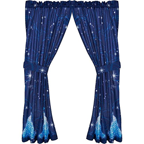 Does your little one dream of dancing the night away like Cinderella? This enchanting curtain set is made of super-soft microfiber and features silhouettes of Cinderella in her sparkling gown. Make her room a truly royal escape by adding the coordinating comforter, sheet set, and wall accents (sold separately). ... CONTENTS: Two rod pocket curtain panels. Together they measure 82 inches (208 cm) wide x 63 inches (160 cm) long.; Two matching tie-backs.Feature
