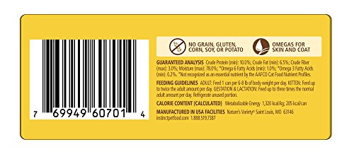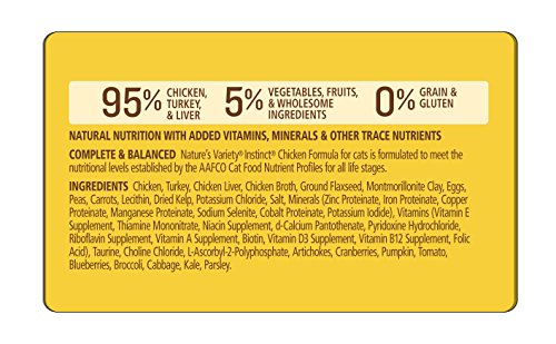 Nature's Variety Instinct is formulated like your pet's ancestral diet – high protein, grain-free, and gluten-free. Each formula is thoughtfully balanced with wholesome foods your pet would eat in nature, like real meat or poultry and healthy vegetables and fruits. Instinct Canned Cat food provides great tasting, quality nutrition free of grains or fillers and is formulated to be rotated with other Instinct grain-free diets to give your cat variety at the food bowl. Feed ancestrally – give pets the nourishment and energy to achieve a healthy, happy life. complete and balanced for all life stages (including kitten, adult and senior). Great for all lifestyles – including indoor cats. Made in USA facilities.Feature